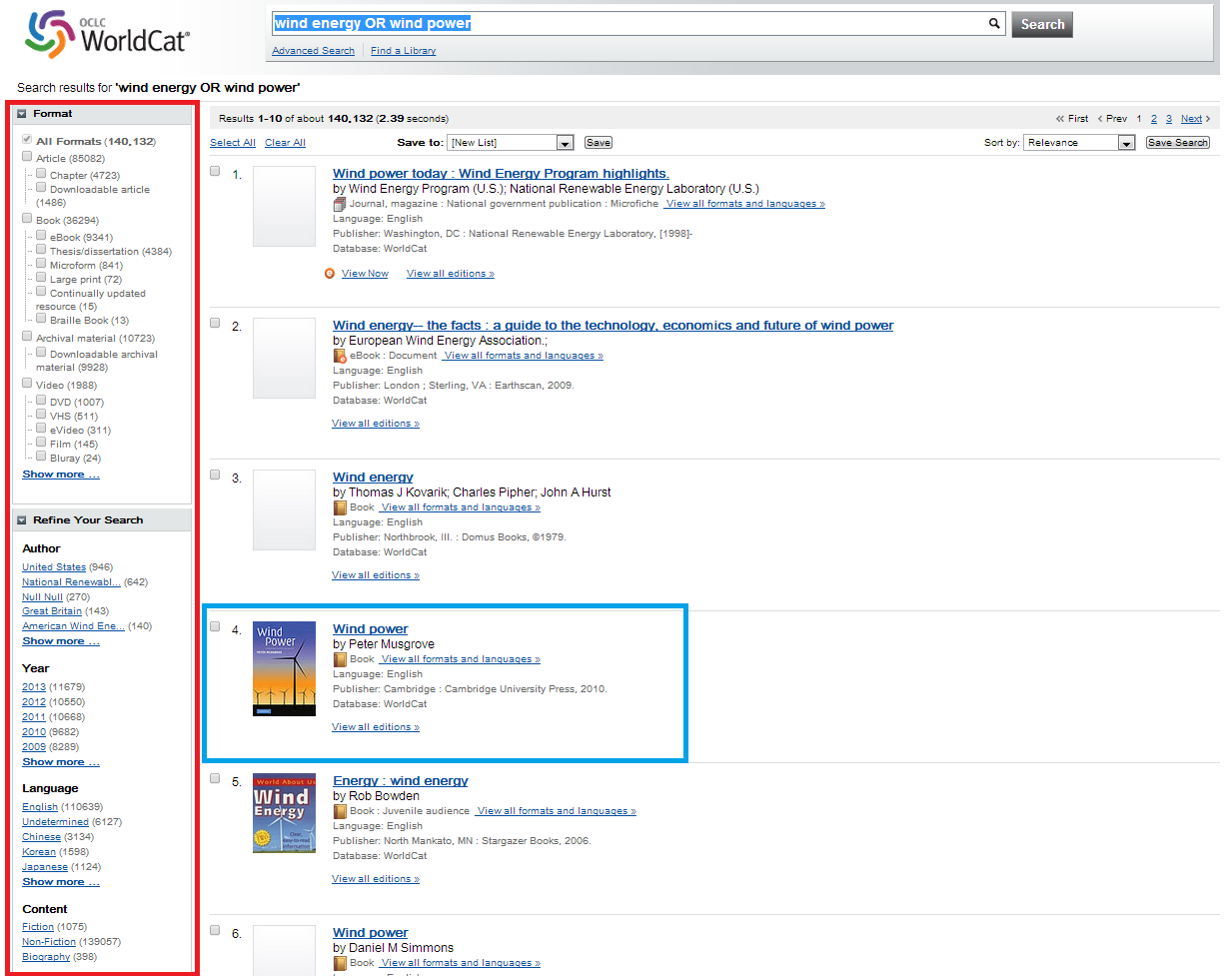Step 2. Narrow down your search using the sidebar filters (red box). Once you have narrowed down your search, click on the title of an item to view more information about the item (blue box).