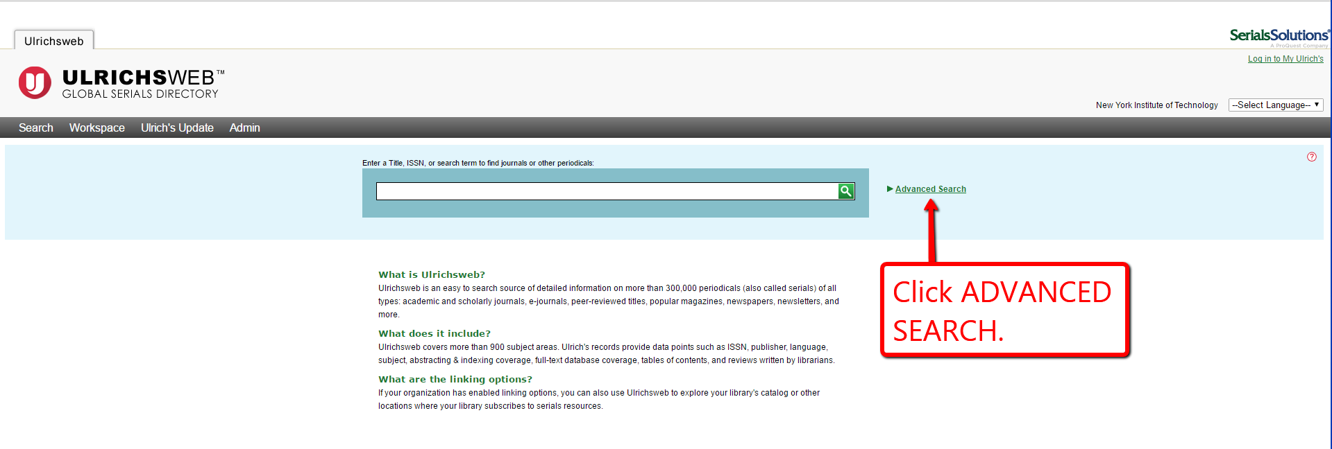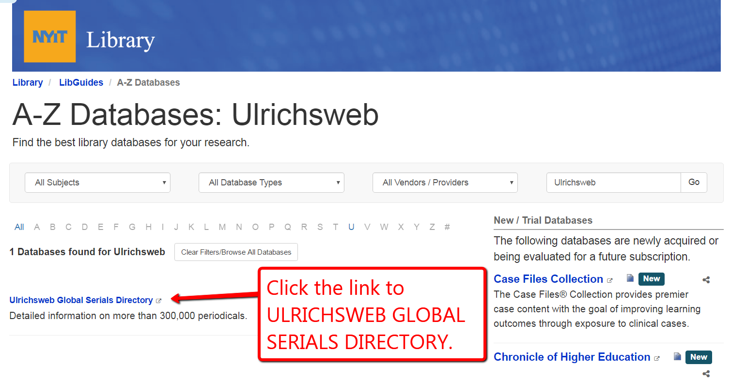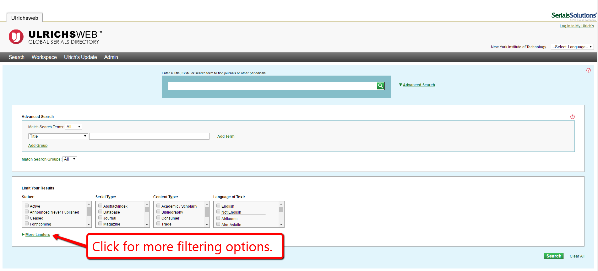 Ulrichsweb is a directory of periodicals provided by Serials Solutions. Locate a periodical of interest by utilizing the keyword and limiter search functions.