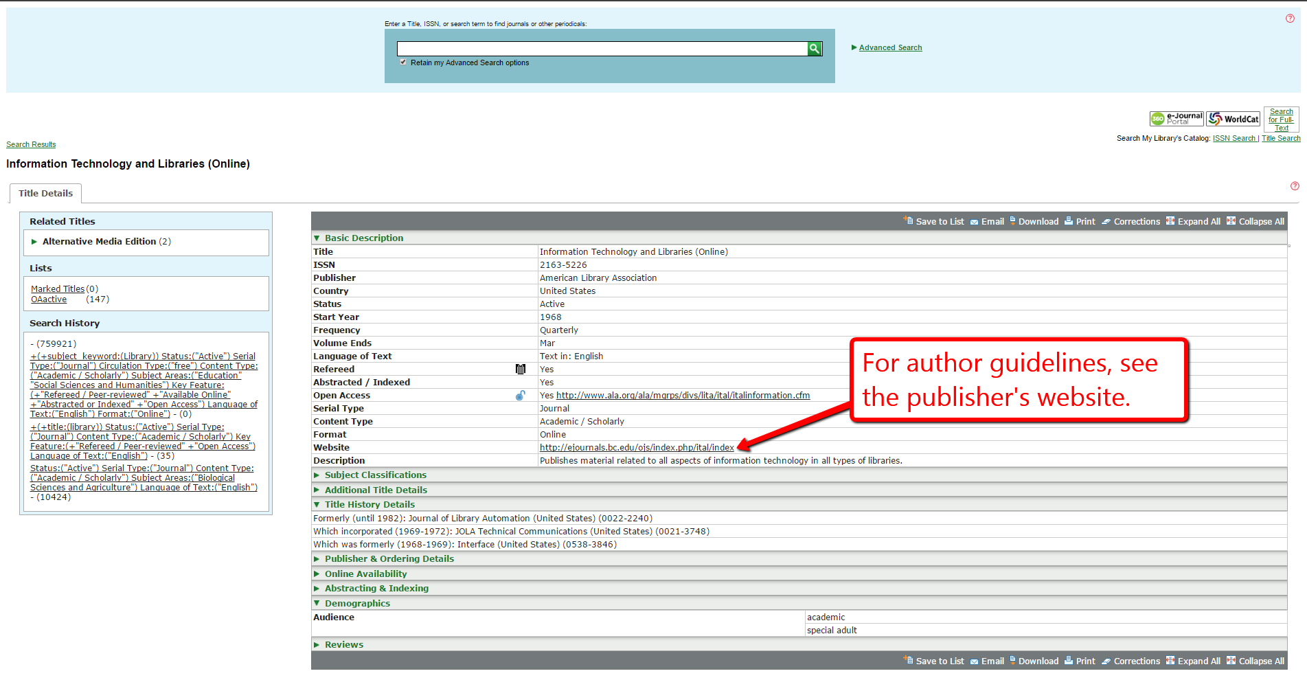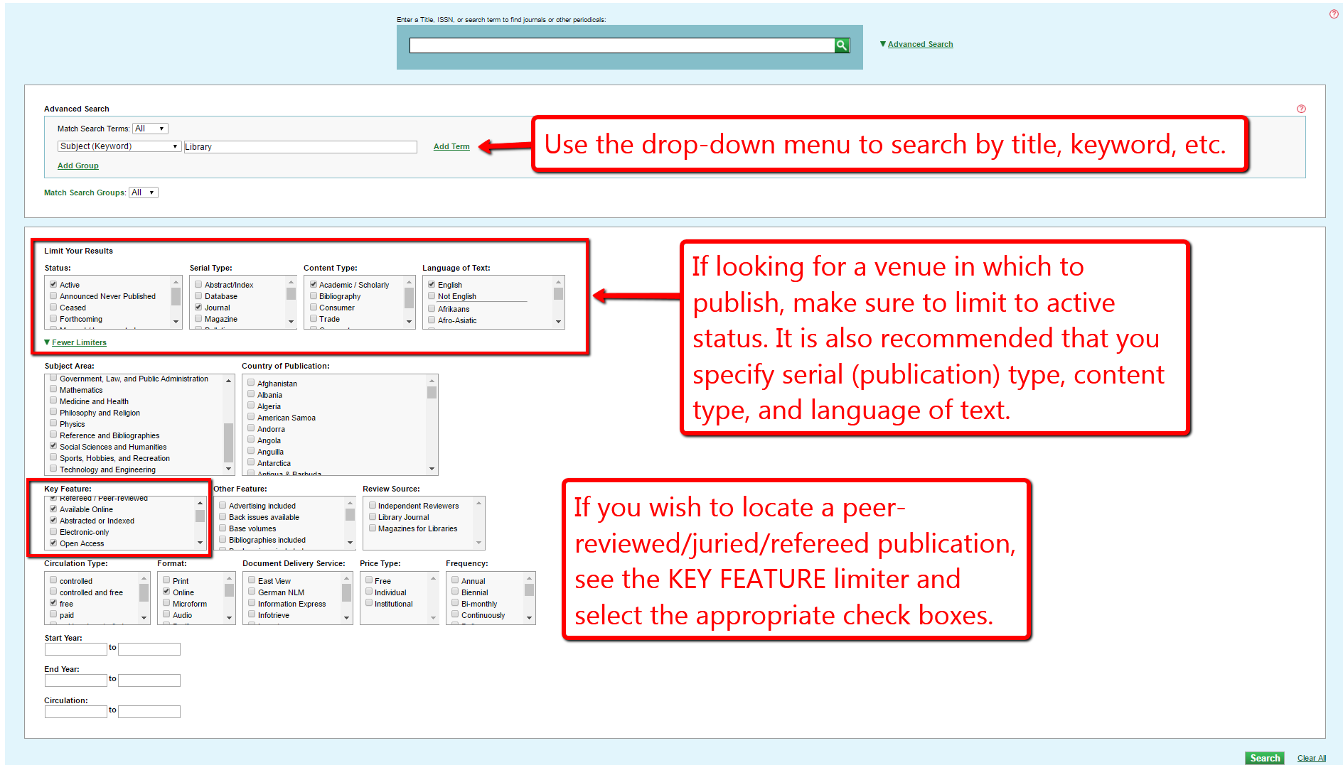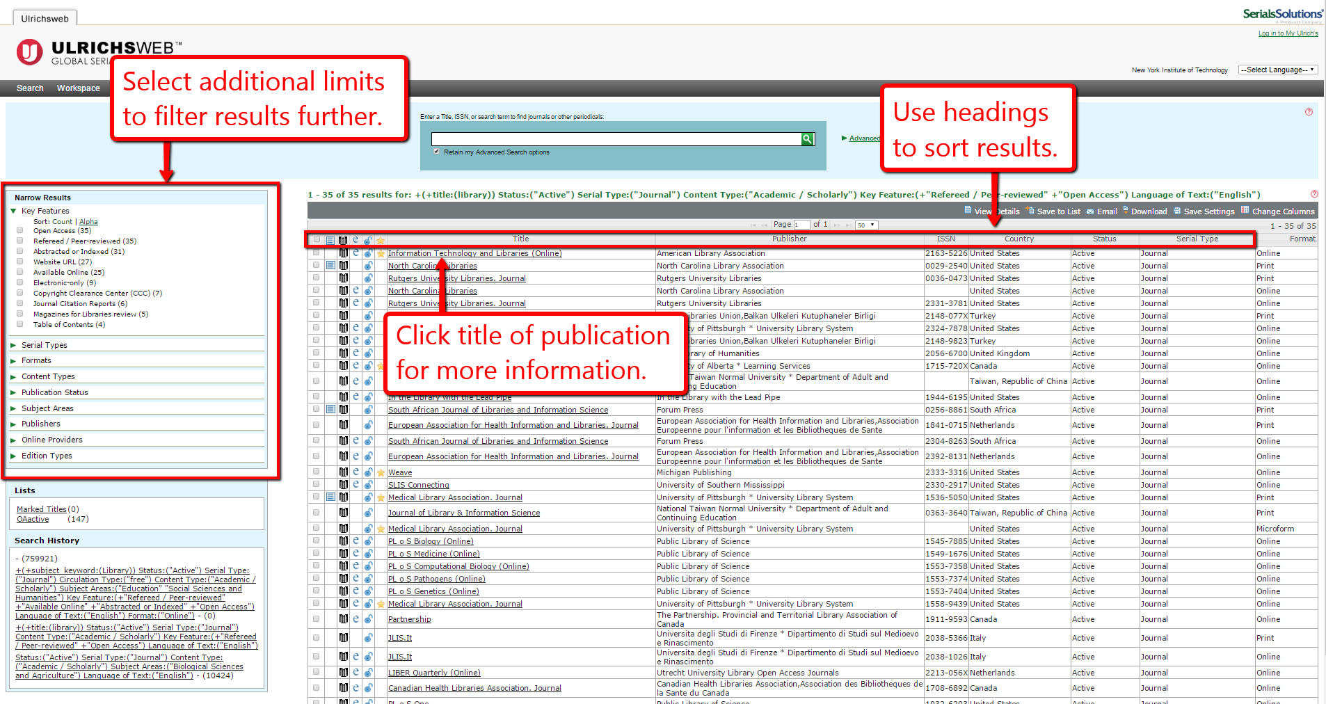 Ulrichsweb is a directory of periodicals provided by Serials Solutions. Locate a periodical of interest by utilizing the keyword and limiter search functions.